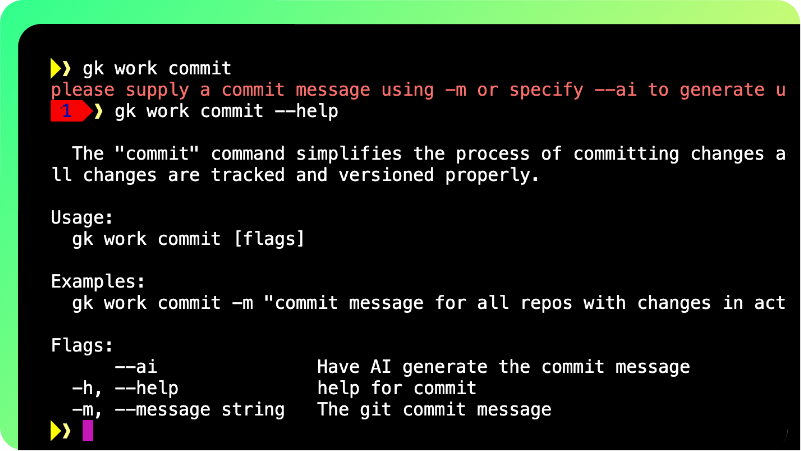 A Work Item is a lifecycle-focused workflow for a task, bug, or feature that you start, work on, and end using the terminal. Created with gk work start < name >, it automates branch setup, checks for open items, and syncs all repos in your workspace. As you work, you can use AI to generate commit messages (gk work commit --ai) and pull requests (gk work pr create --ai( across multiple repos in parallel. When done, gk work end wraps it up by cleaning your workspace.